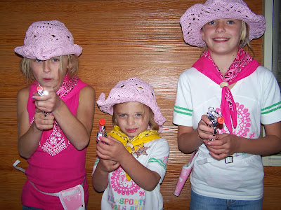 After our adventure hiking to Old Faithful the kids arrived back to the cabin and found their second letter in the Pony Express Mail. The letter read... It is now time to begin our cowboy and cowgirl games. Everyone needs to bring their hat and scarf. If you don't eat your dinner you cannot play. Hope that you had a great day at Old Faithful. Grandpa and Grandma gave the kids Guns for the day to start their Cowboy Adventure. The games for the day included a quizzy learning game where Grandma asked the kids questions about the discovery Research Center which we had visited last night and earlier this morning. The kids earned squishy bears when they answered the questions correctly. Grandma also talked to the kids about what you should do if you come in contact with a bear. The following activity Grandpa had the kids lassoing Snacks such as Cheese Balls, Carmel Popcorn, Pop and Candy with a Rope. After that Grandpa’s next game was a cowboy and Indian search. Grandpa hid cowboys and Indians outside and the kids searched for them. For every cowboy and Indian the kids returned they received a quarter. The last game consisted of throwing their cowboy hat through a Hula Hoop the prize for that game was a dollar bill. Payton spent the evening walking around telling everyone that he had a real gun. Payton is having so much fun dressing up like a cowboy; I am enjoying watching him get so excited.